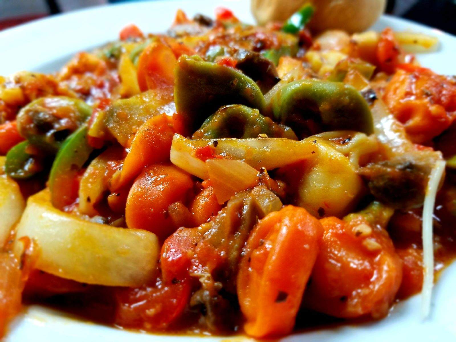 Tortellini Pasta Tossed in Homemade Marinara Sauce, Mushrooms, Carrots, Tomatoes, Onions, & Bell Peppers.